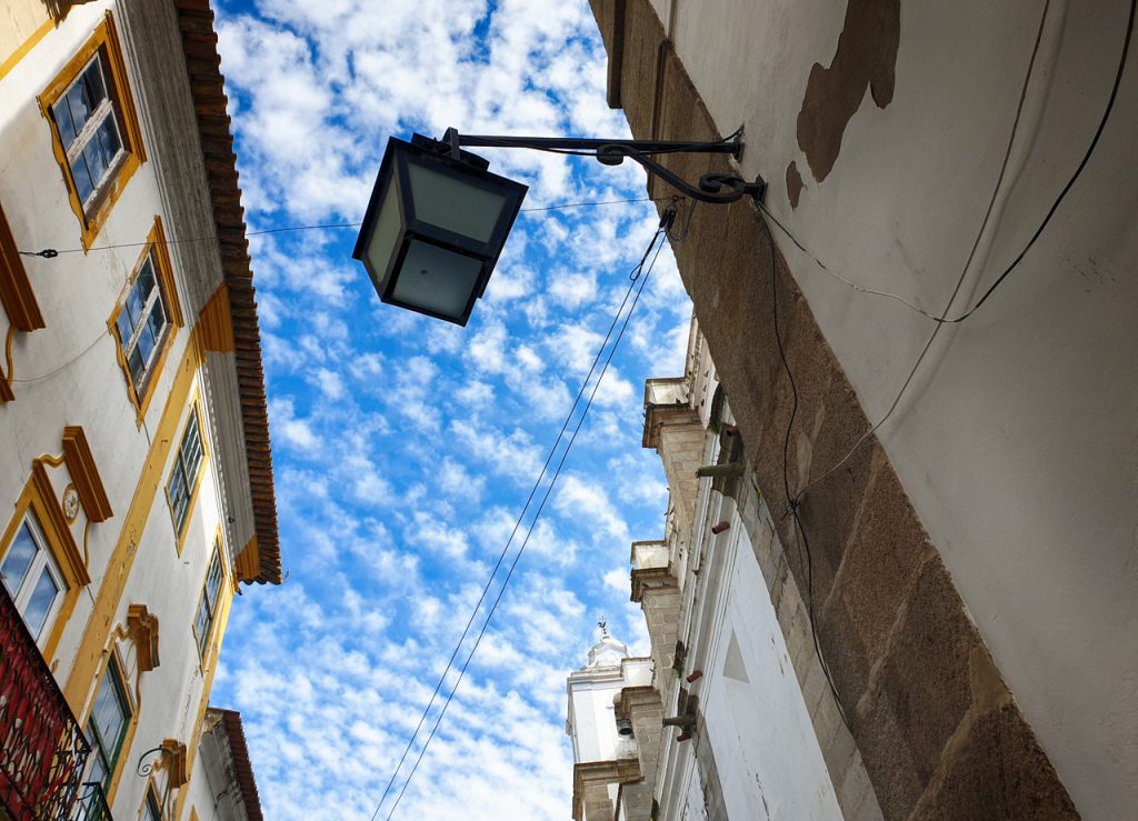 A rua dos Mercadores está hoje bem mais tranquila. Vamos até ao fim, depois iniciamos o regresso a casa sem pressas, escolhendo as vielas mais estreitas. A luz está deliciosa e a iluminação pública já está ligada. Um grande final de tarde de temperatura amena e o azul possível lá em cima, no céu.